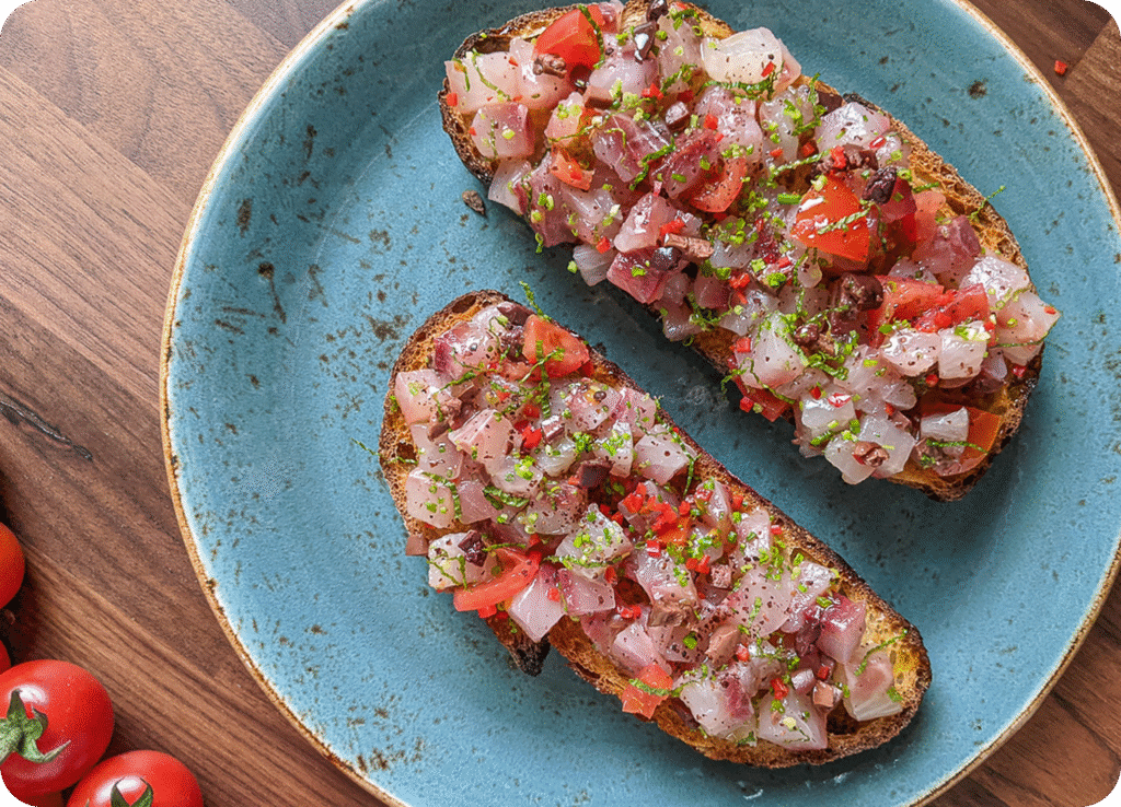 The tomatoes and olives folded into the tartare give this dish a very summery flavour. But feel free to use the same technique for whatever mix of ingredients you have at your disposal.